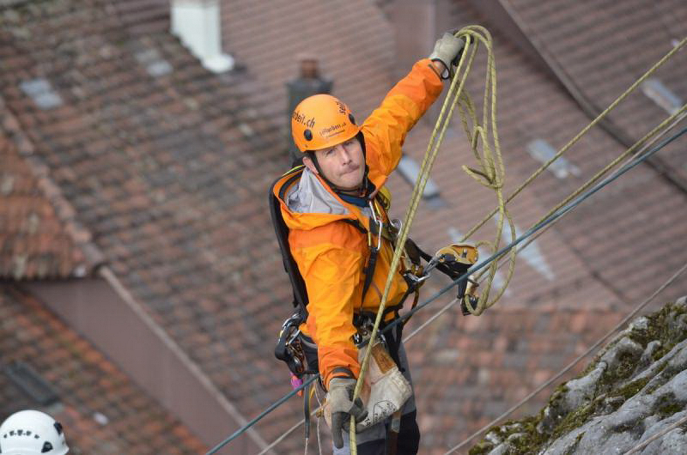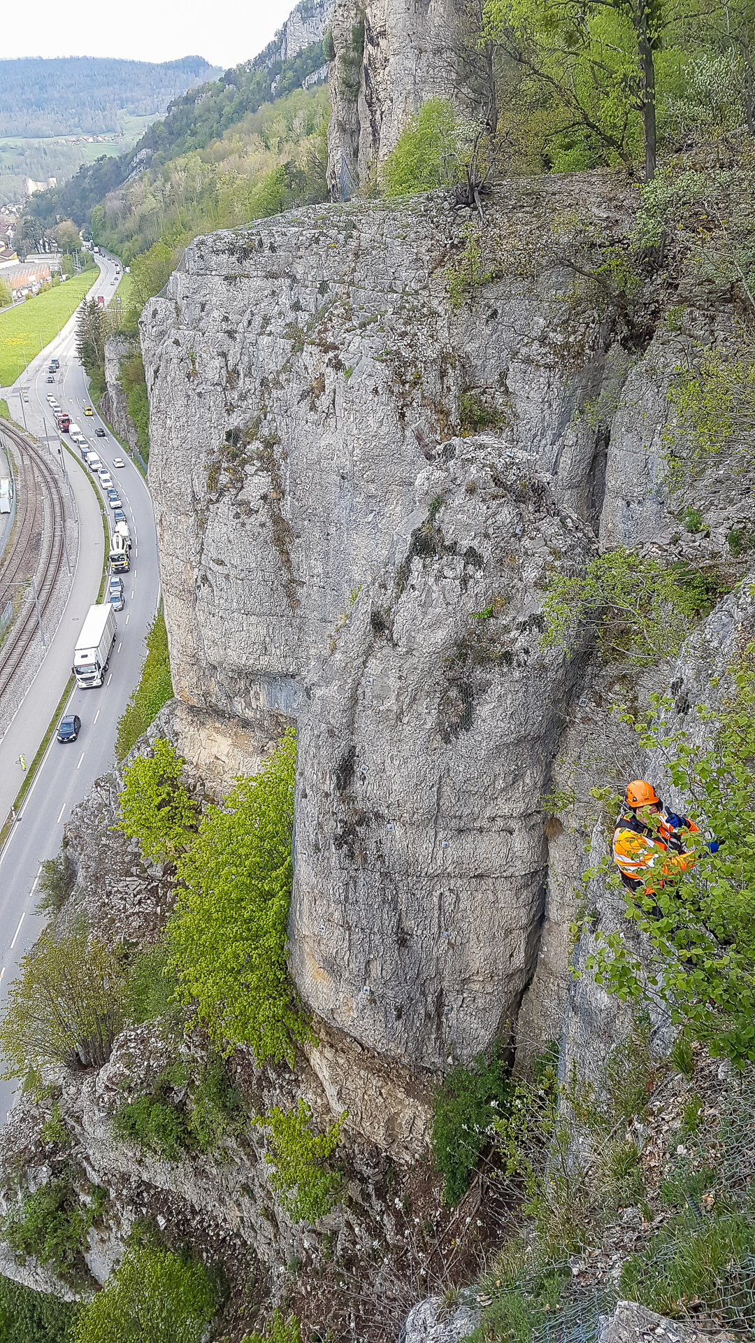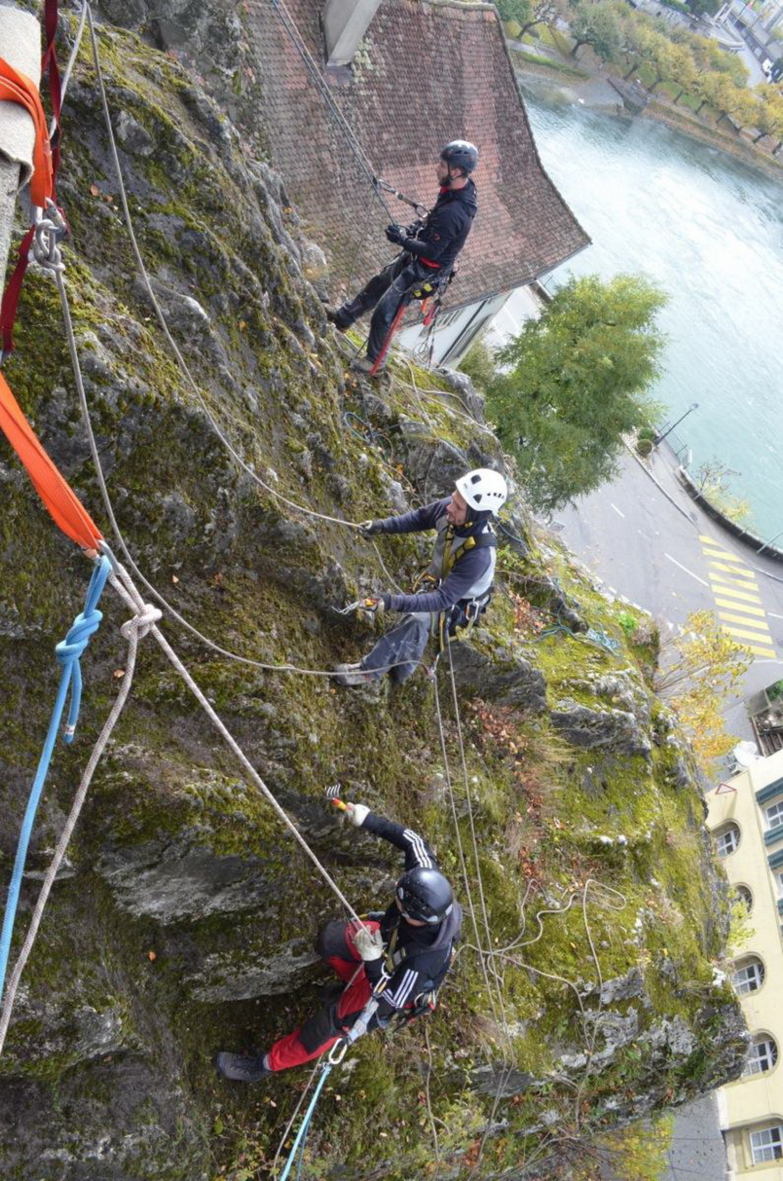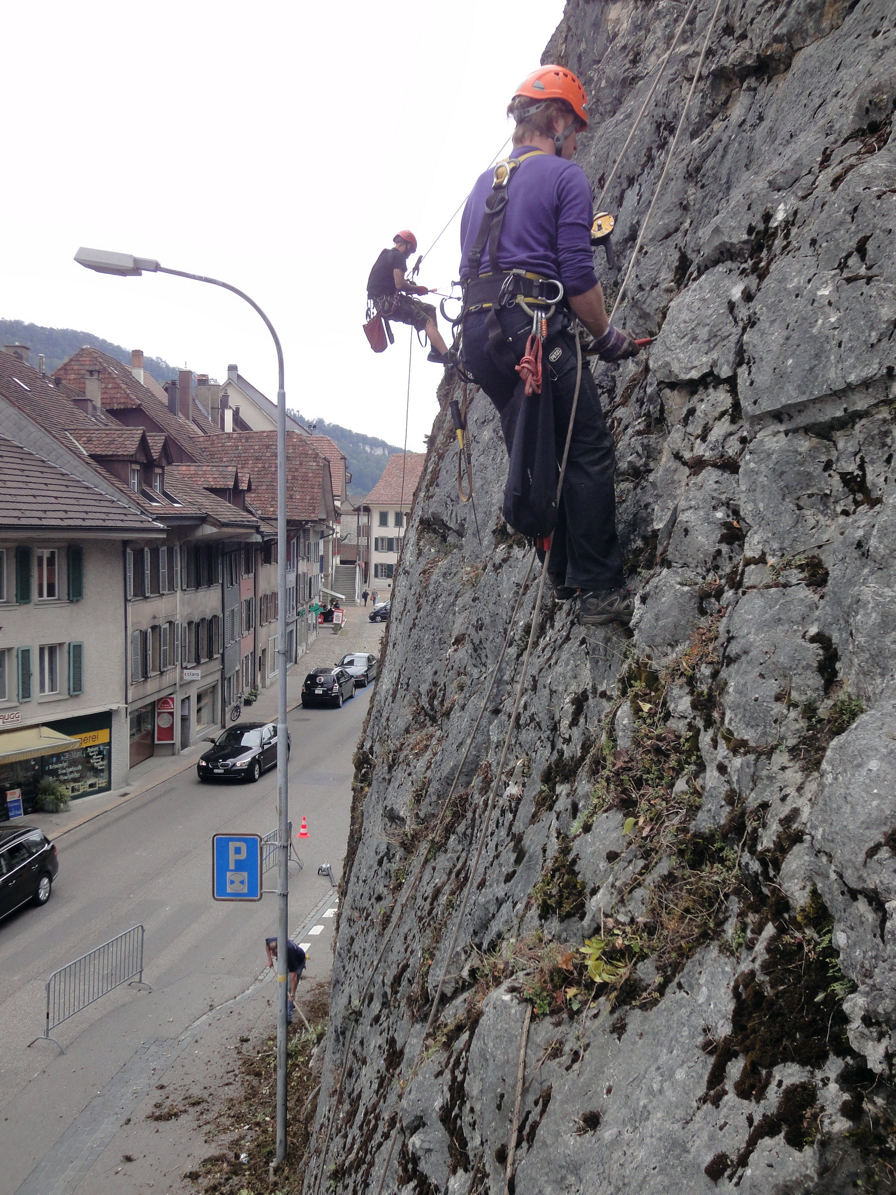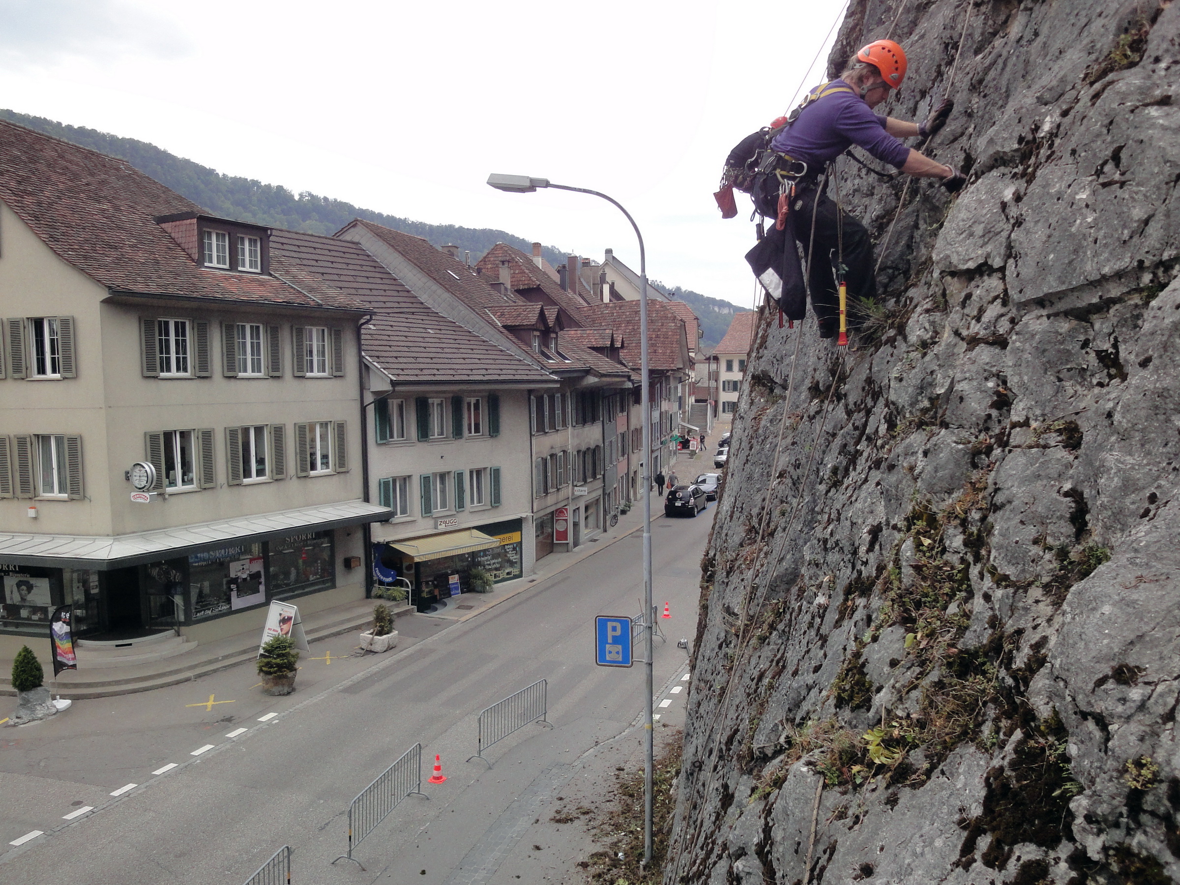 Felsräumungen können nötig werden, wenn sich oberhalb von Strassen lose Felspartien befinden und diese eine Gefährdung für den Verkehr darstellen. Dazu werden Strassen und Wege gesperrt und unsere Seilarbeiter räumen am hängenden Seil lockeres Gestein aus den Felswänden.