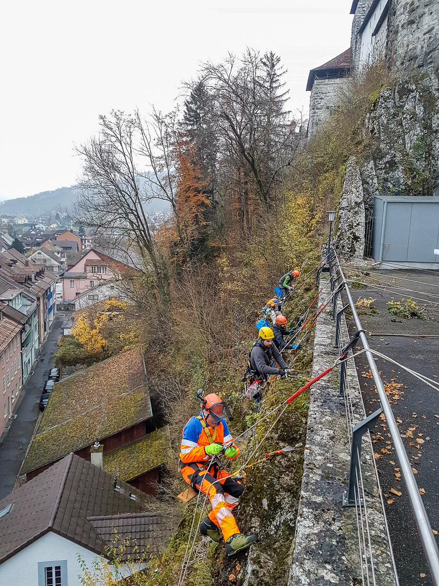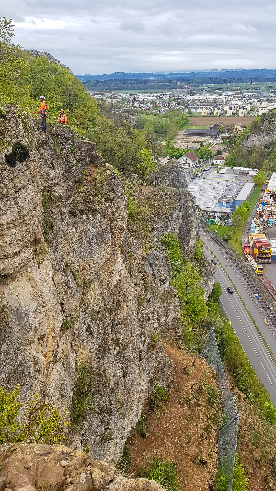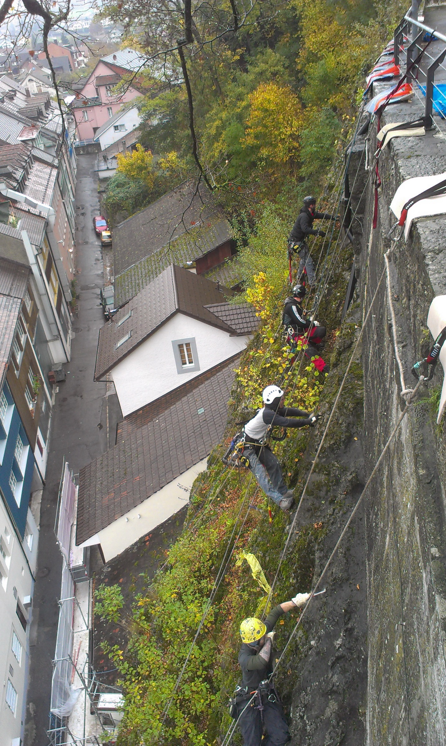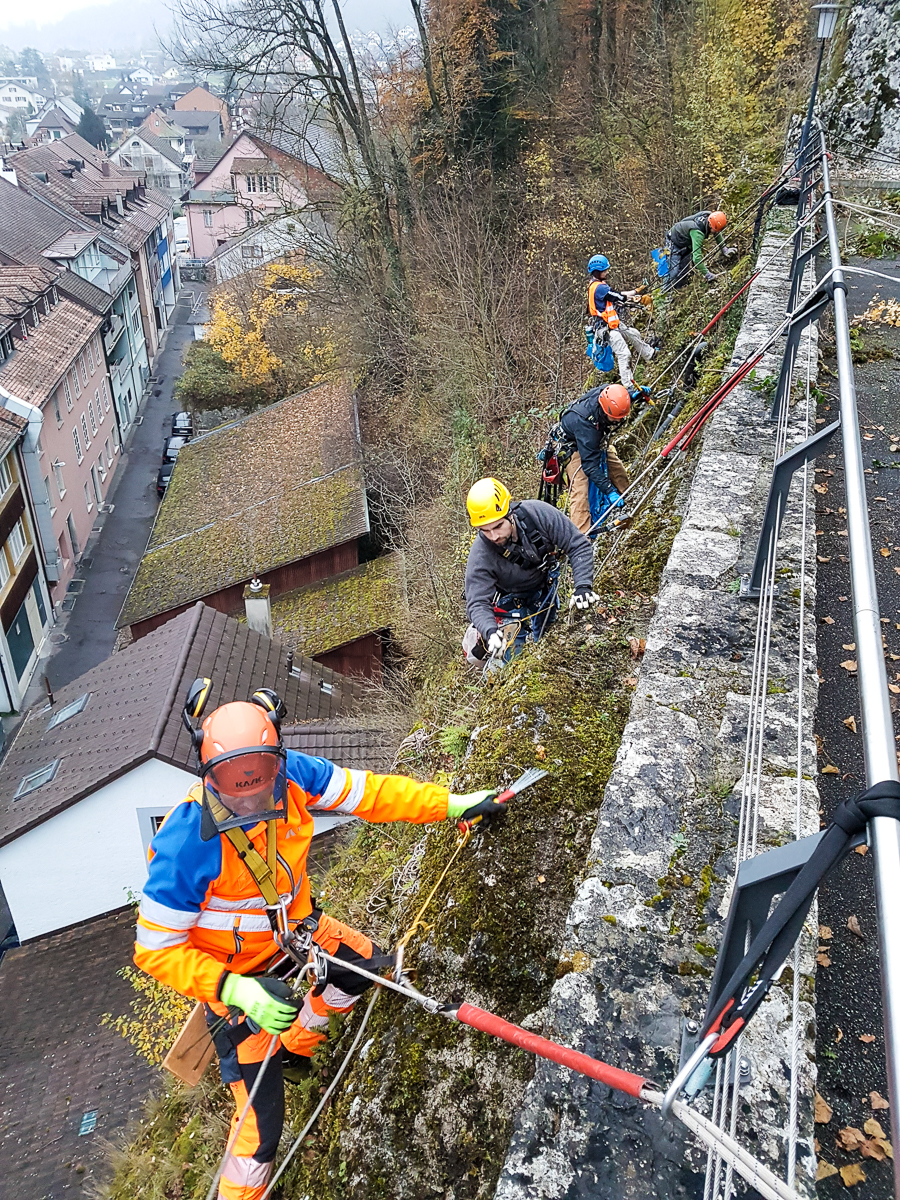 Felsräumungen können nötig werden, wenn sich oberhalb von Strassen lose Felspartien befinden und diese eine Gefährdung für den Verkehr darstellen. Dazu werden Strassen und Wege gesperrt und unsere Seilarbeiter räumen am hängenden Seil lockeres Gestein aus den Felswänden.
