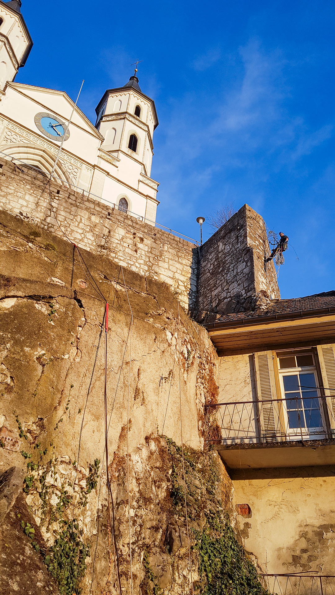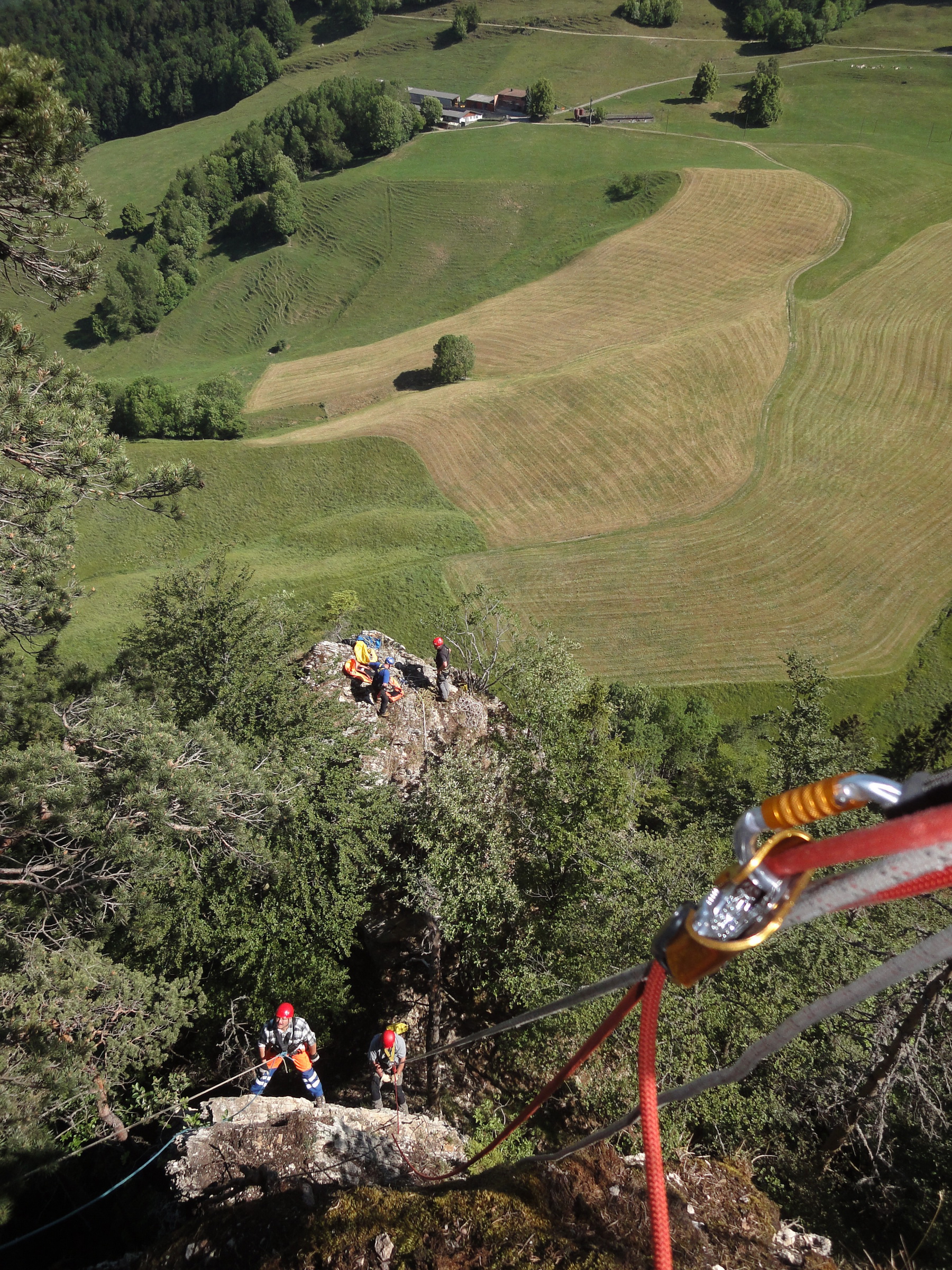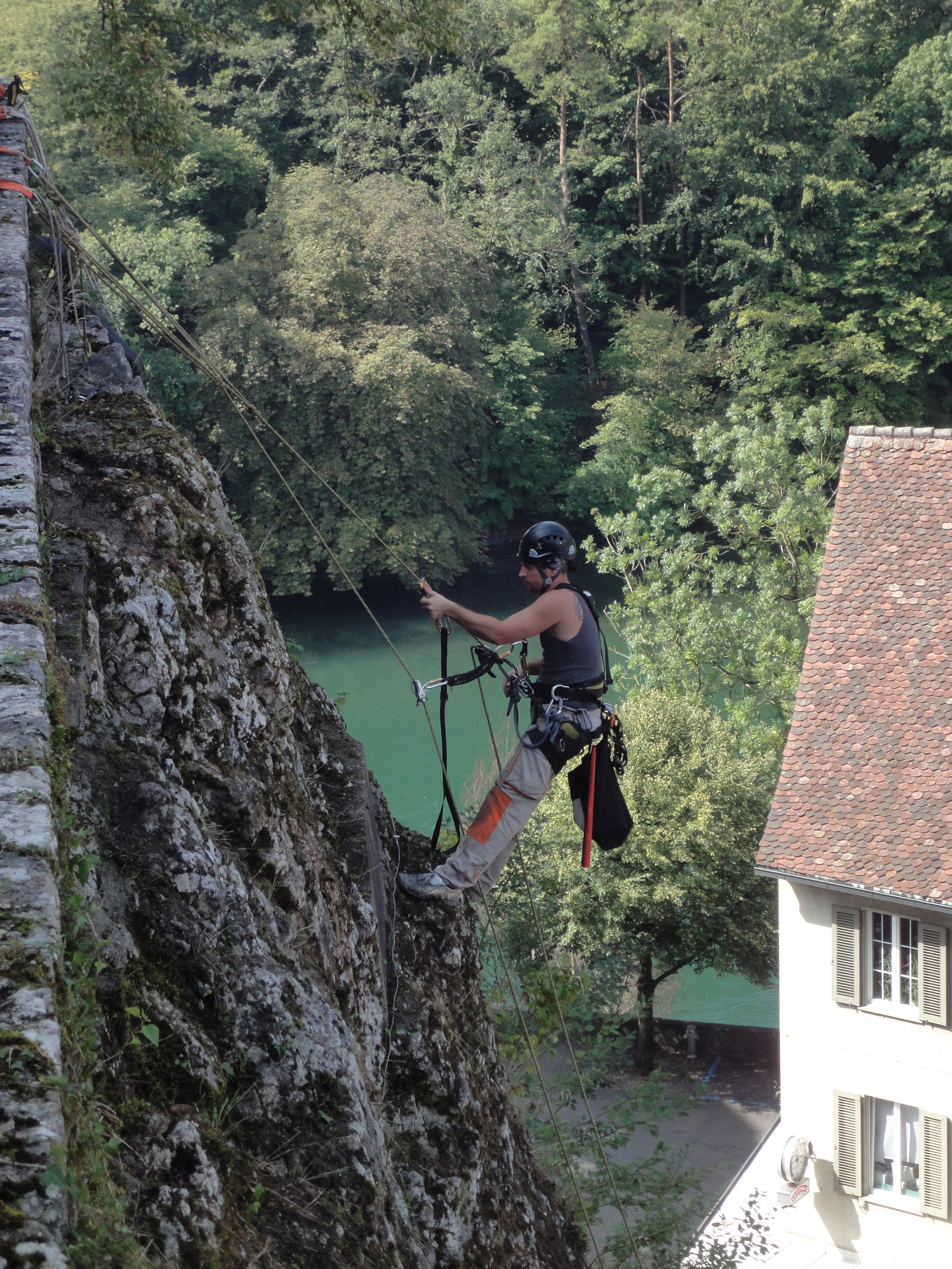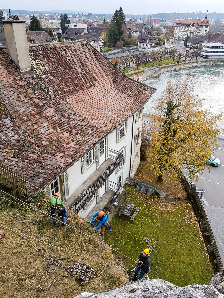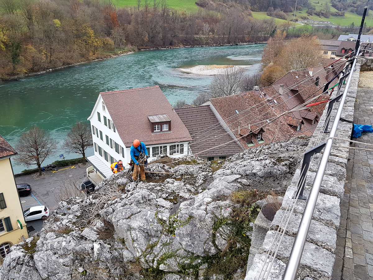 Felsräumungen können nötig werden, wenn sich oberhalb von Strassen lose Felspartien befinden und diese eine Gefährdung für den Verkehr darstellen. Dazu werden Strassen und Wege gesperrt und unsere Seilarbeiter räumen am hängenden Seil lockeres Gestein aus den Felswänden.